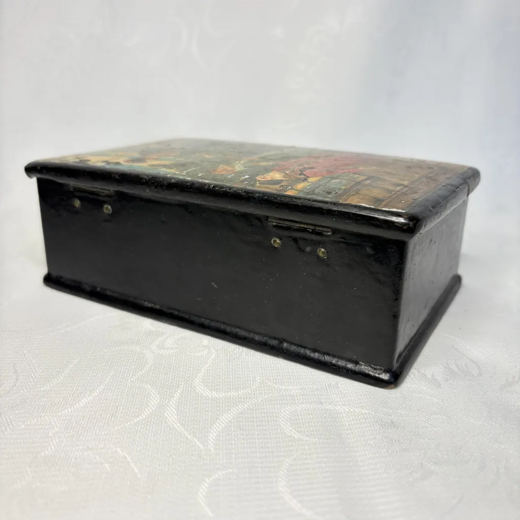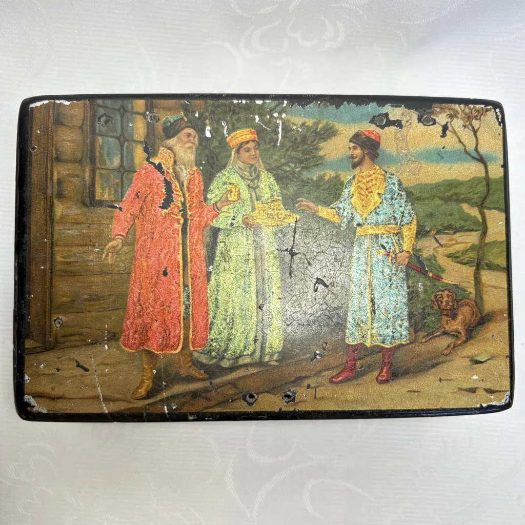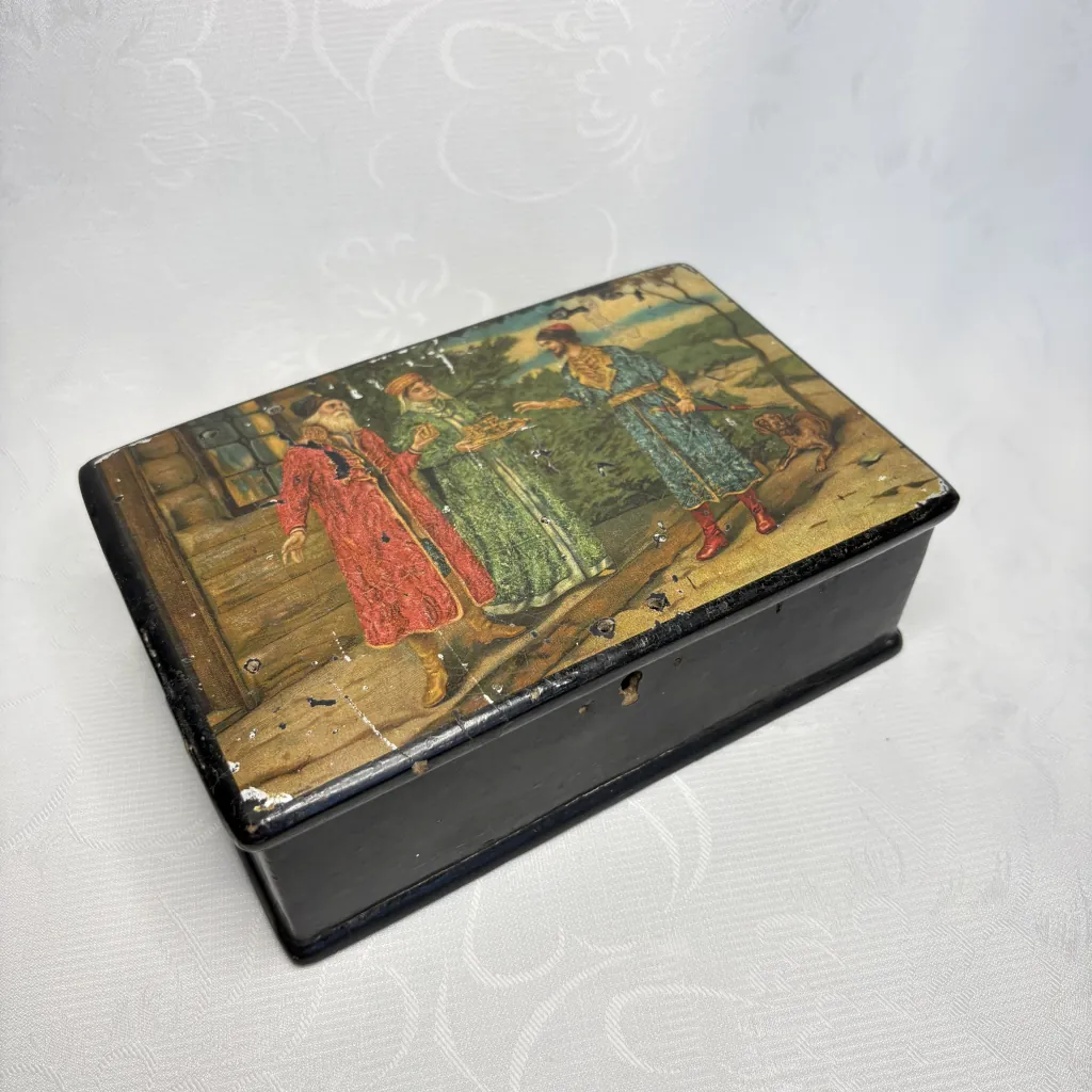 Антикварная шкатулка “Встреча гостя”, папье-маше, роспись по серебряному грунту, Российская Империя, конец XIX – начало XX века.