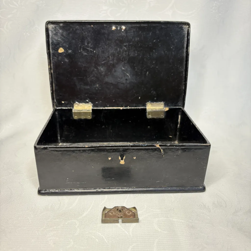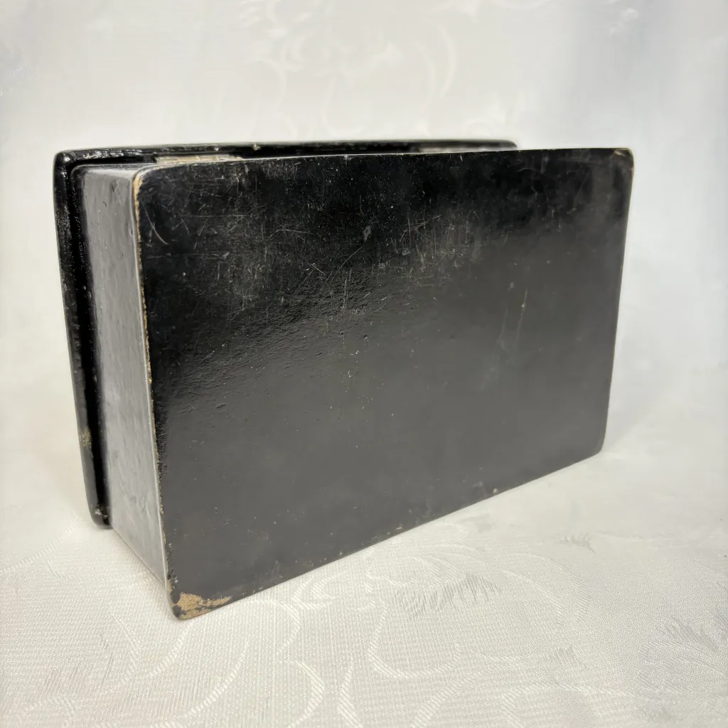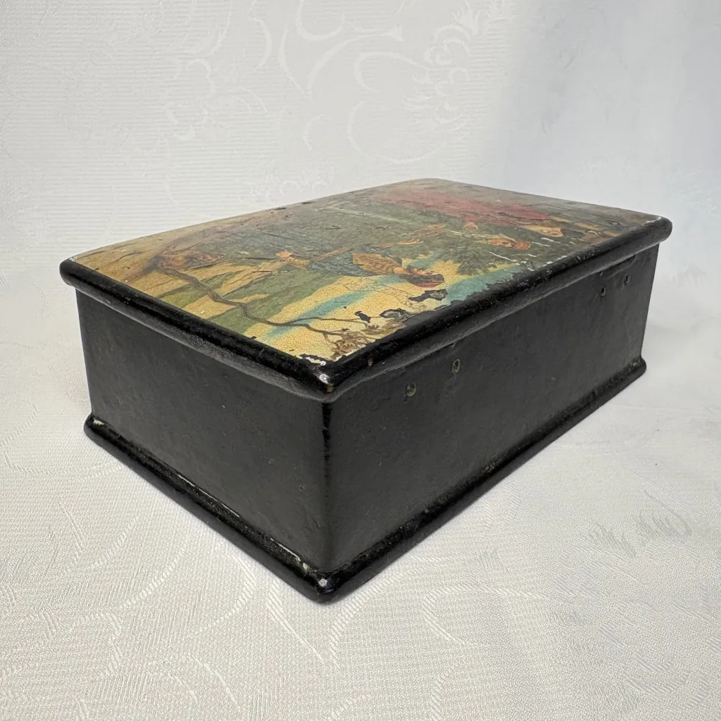 Антикварная шкатулка “Встреча гостя”, папье-маше, роспись по серебряному грунту, Российская Империя, конец XIX – начало XX века.