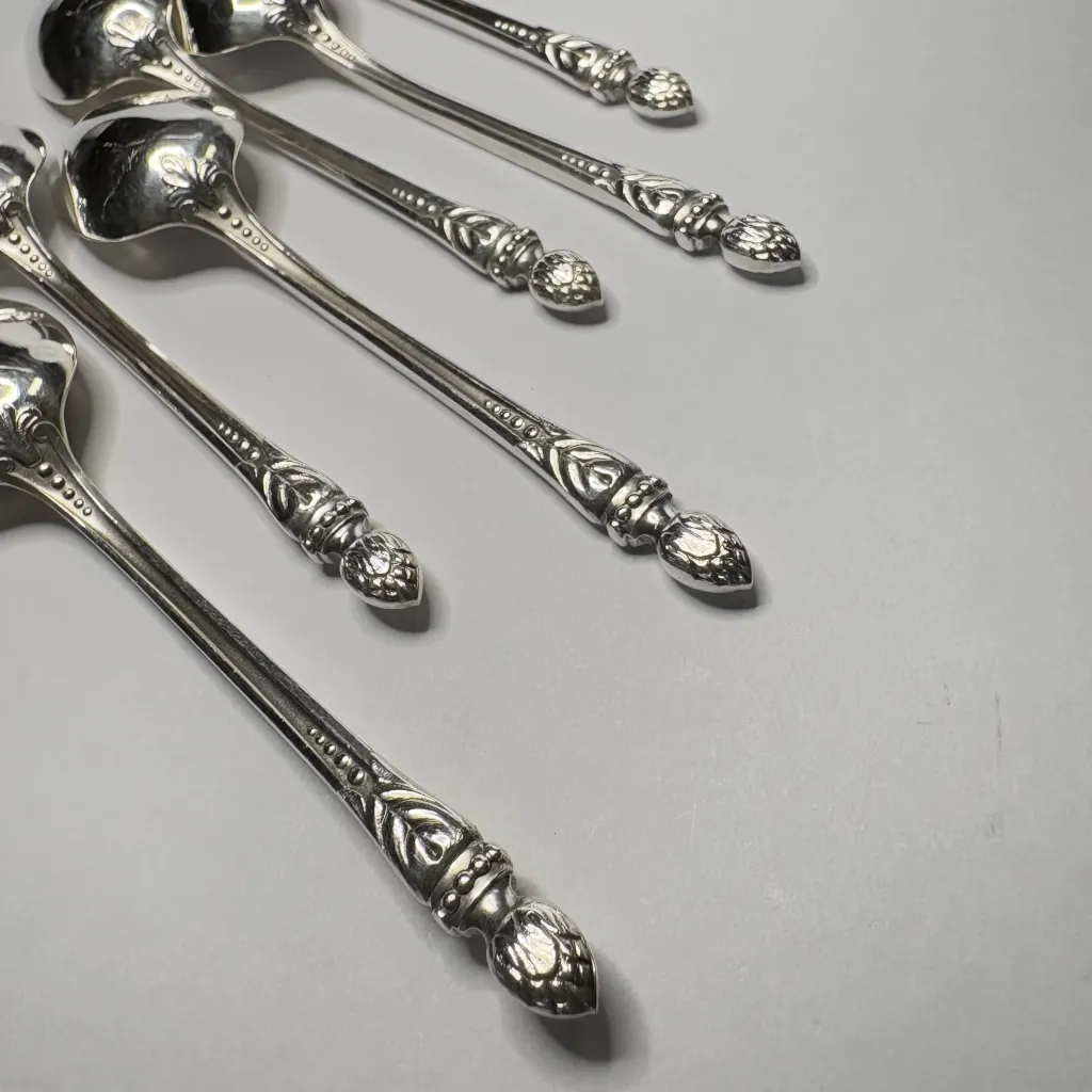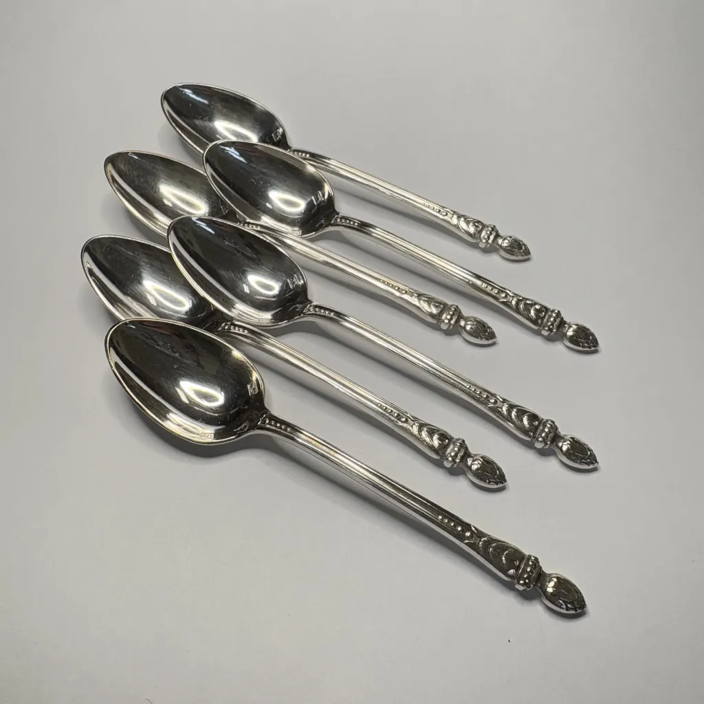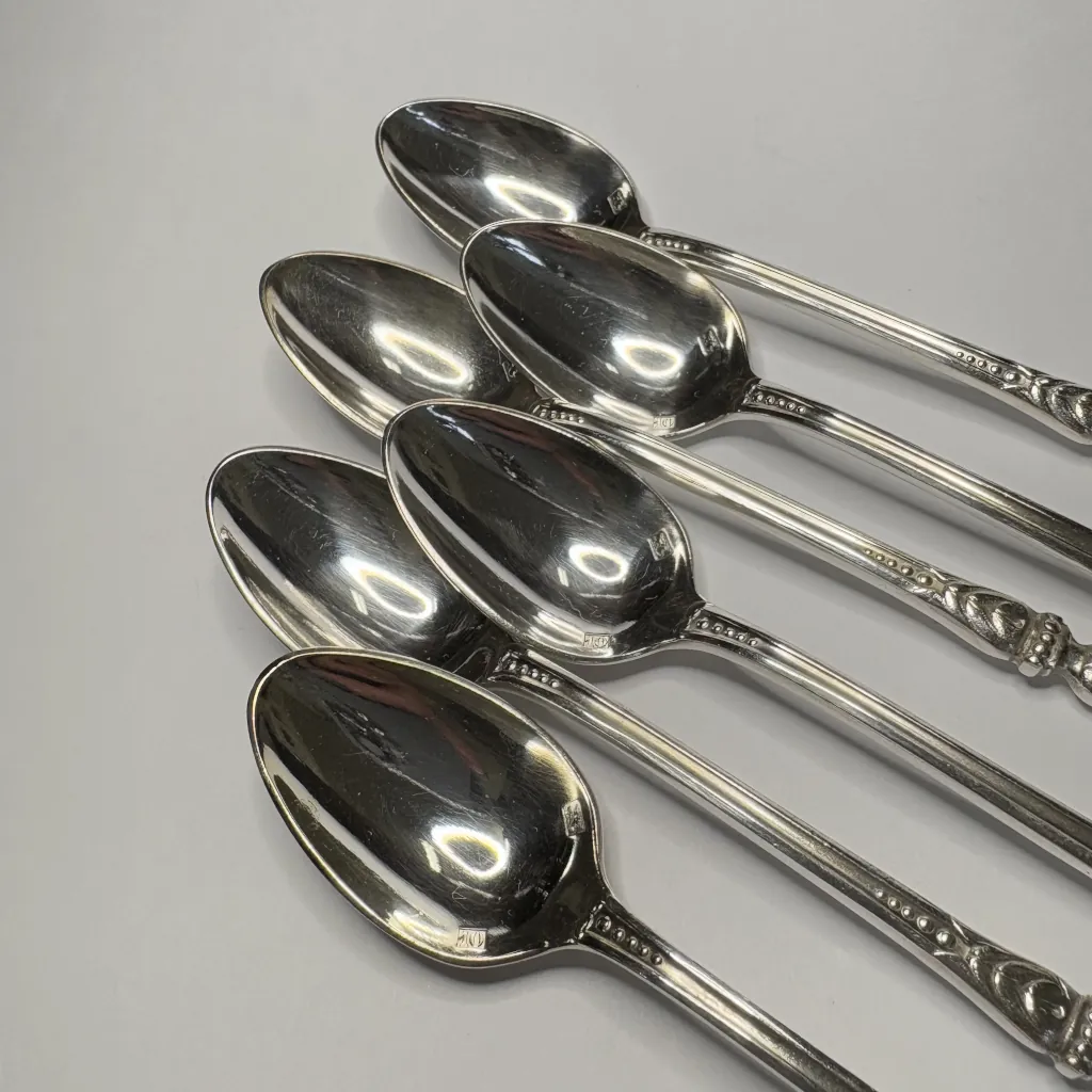 Набор из шести ложек для мокко (кофейных ложек), сплав немагнитных металлов, серебрение, два клейма на черпале, Европа.