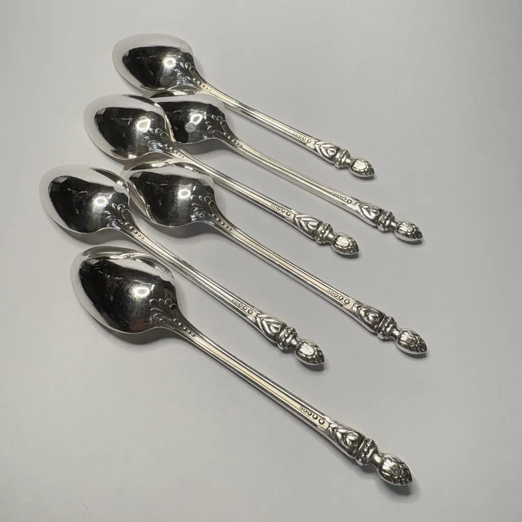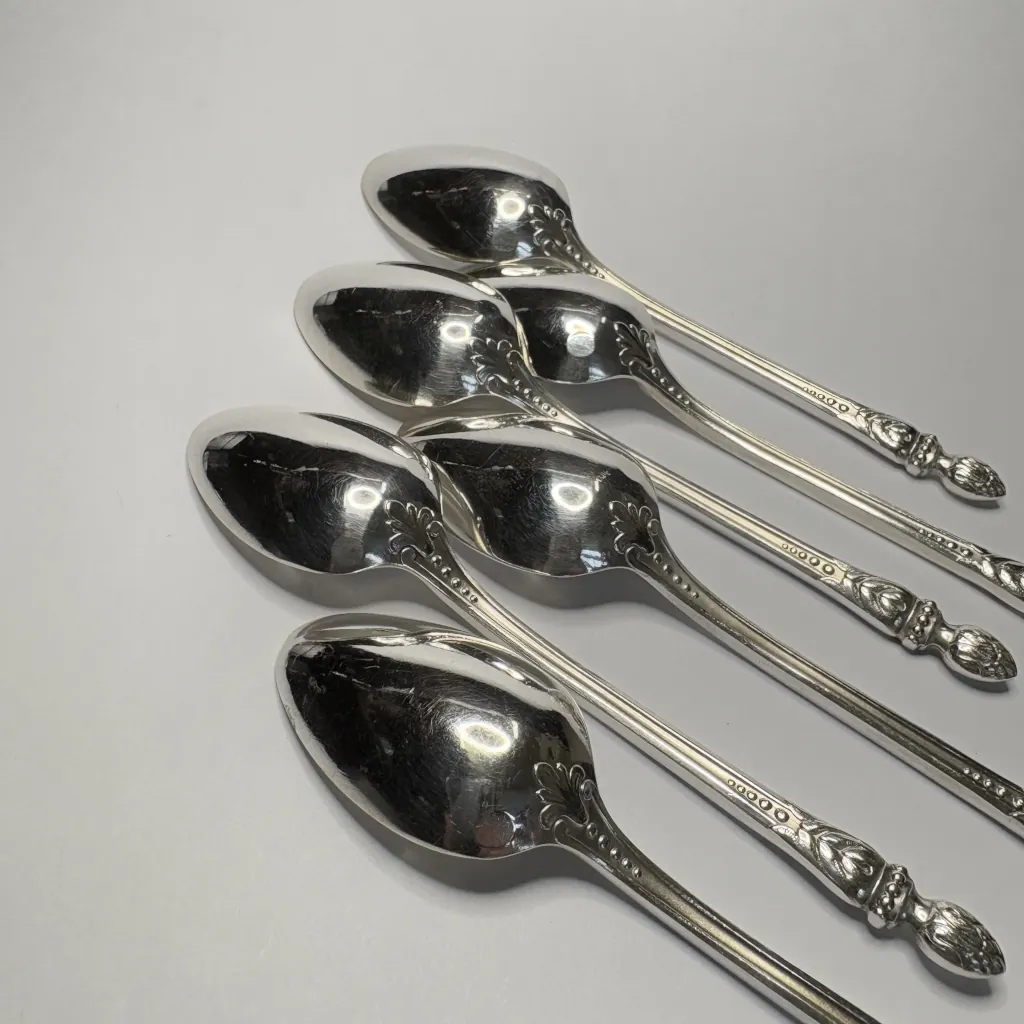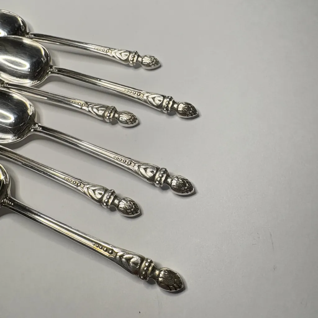 Набор из шести ложек для мокко (кофейных ложек), сплав немагнитных металлов, серебрение, два клейма на черпале, Европа.
