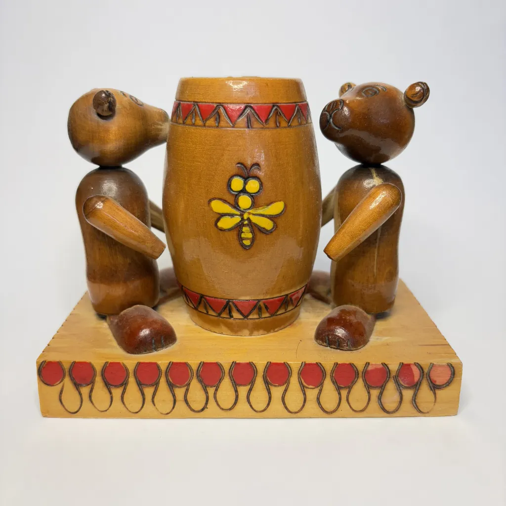Подсвечник “Мишки с бочонком мёда”, дерево, роспись, СССР.