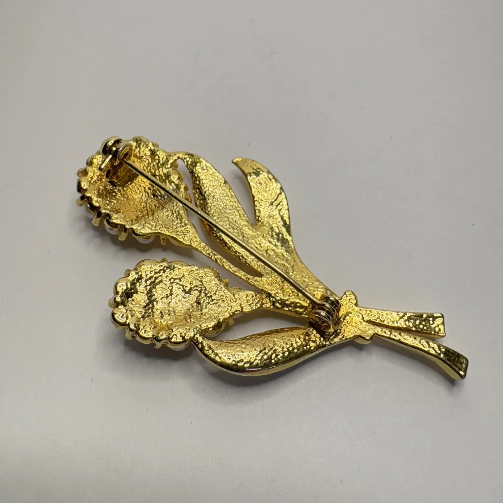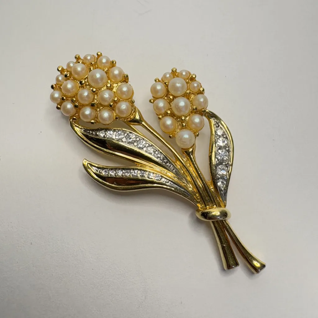 Винтажная брошь, выполненная в виде цветов с искусственным жемчугом и стразами в оправе золотистого цвета.